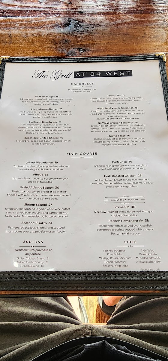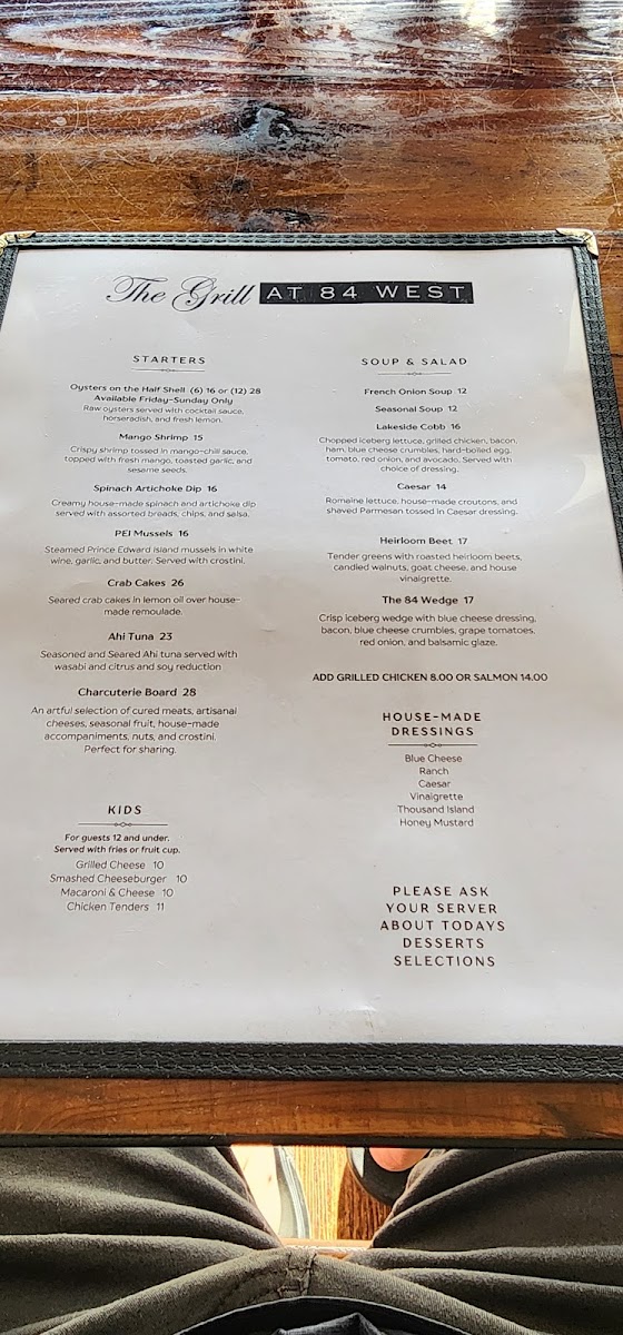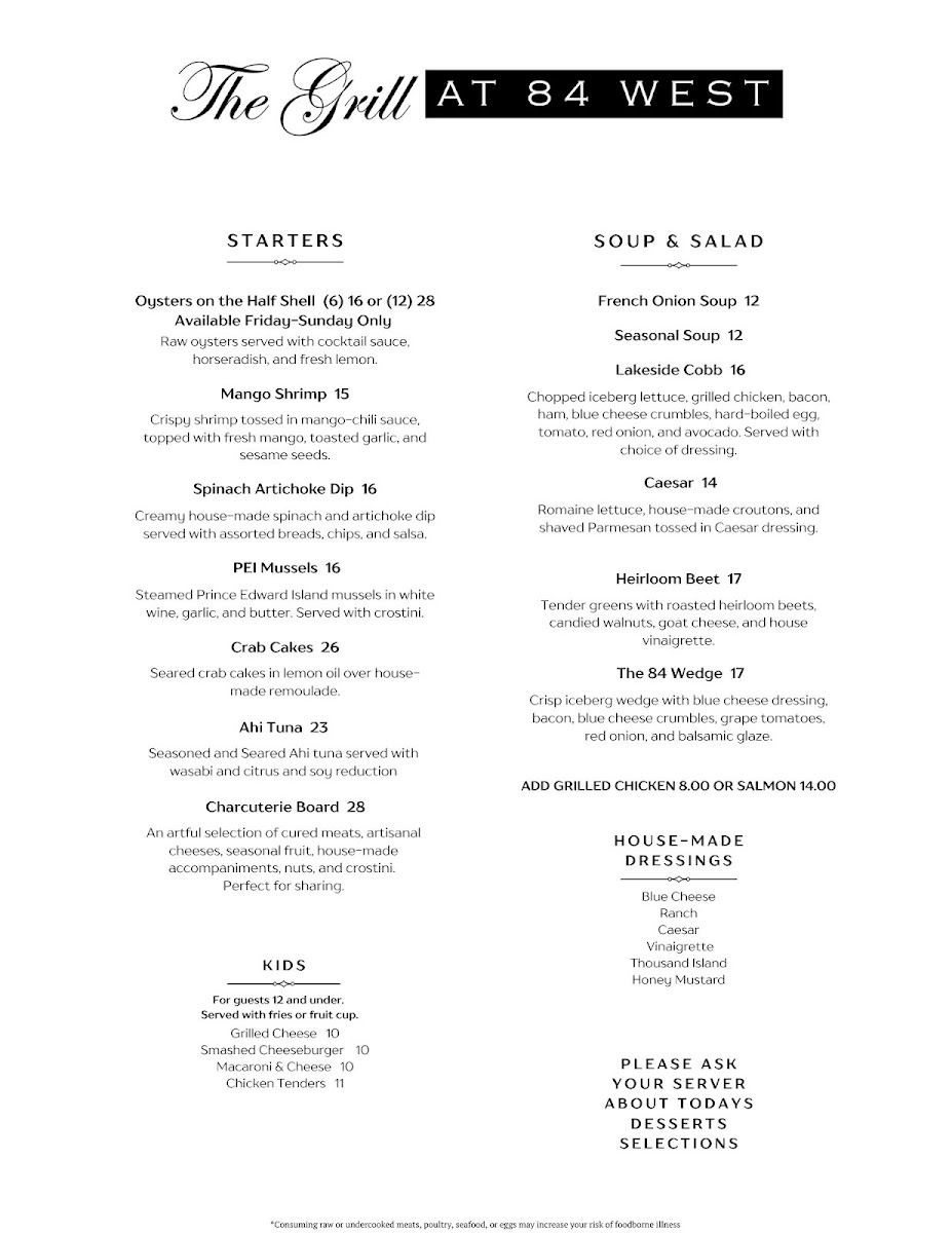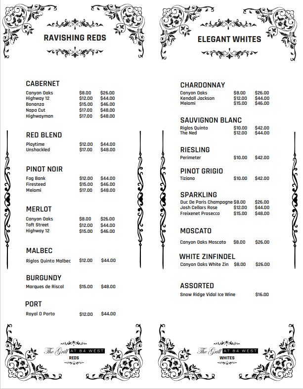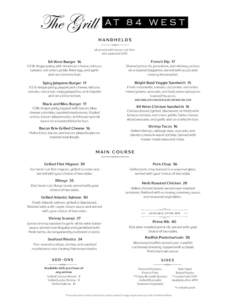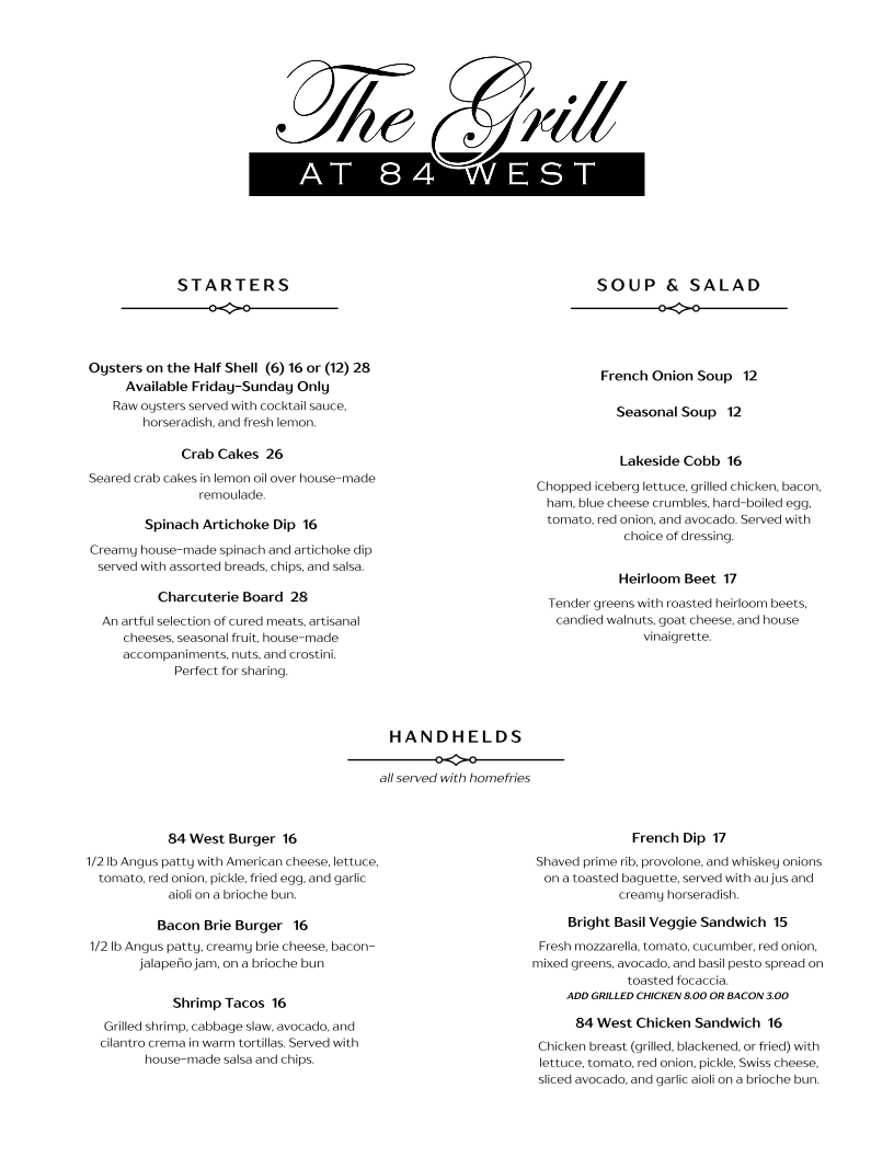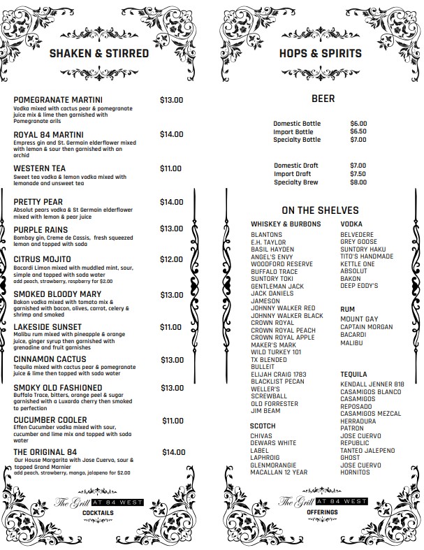 At The Grill At 84 West Menu, you're in for a treat! This cozy gem tucked away in Denison, Texas, serves up a delicious array of classic comfort foods, from sizzling steaks to mouth-watering burgers. Whether you're craving a tender grilled chicken or a fresh, vibrant salad, the menu has something for everyone. Pair your meal with a refreshing drink, and you'll be all set for a satisfying dining experience. The warm, inviting atmosphere complements the hearty dishes, making it the perfect spot for a casual meal with friends or family. Enjoy a wide selection of flavorful options that will surely leave you coming back for more.